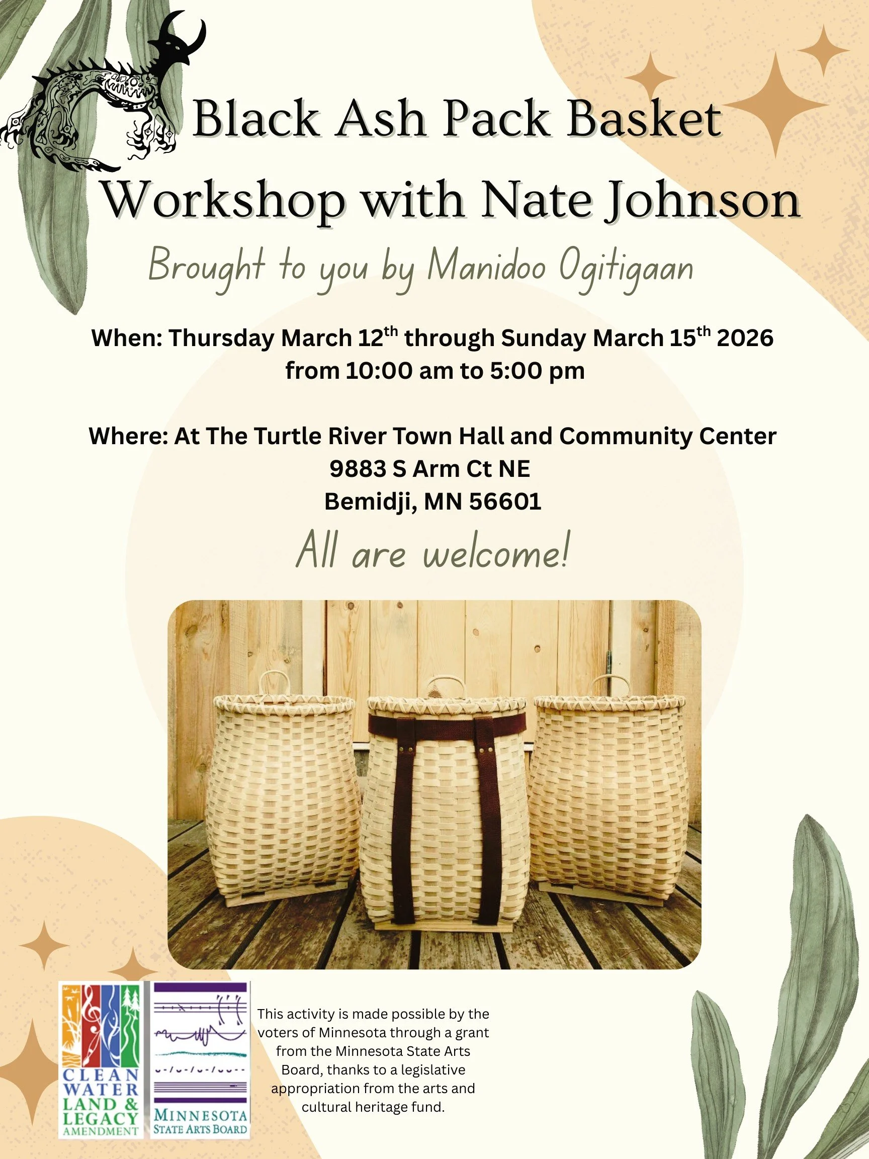 Learn how to make black ash pack baskets from harvest to finish with local artist, Nate Johnson. This four-day workshop for adults will begin on Thursday, March 12th, continue on Friday, March 13th, and Saturday, March 14th, and end on Sunday, March 15th. The class will take place from 10 am to 5 pm each day at the Turtle River Township Community Center.